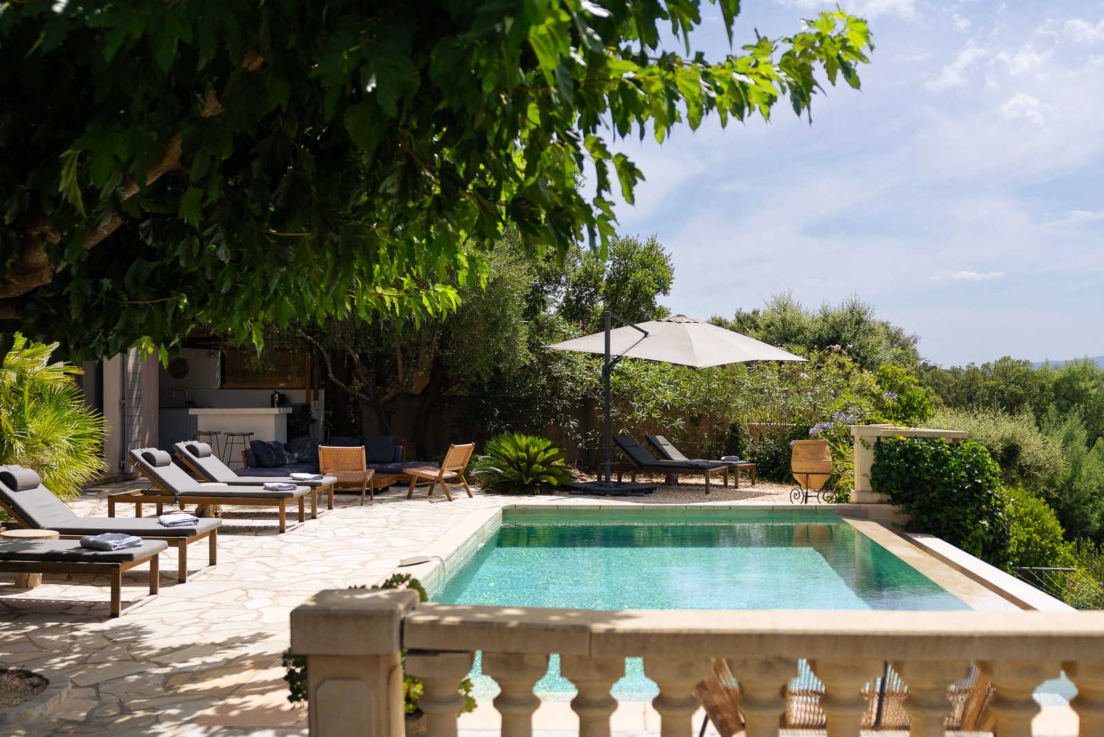 Sfeervol vakantiehuis met privé zwembad op het prachtig Domaine La Nartelle. 100% privacy. Fraai uitzicht over Pins Parasols naar de Middellandse Zee.