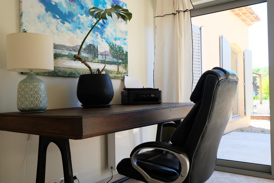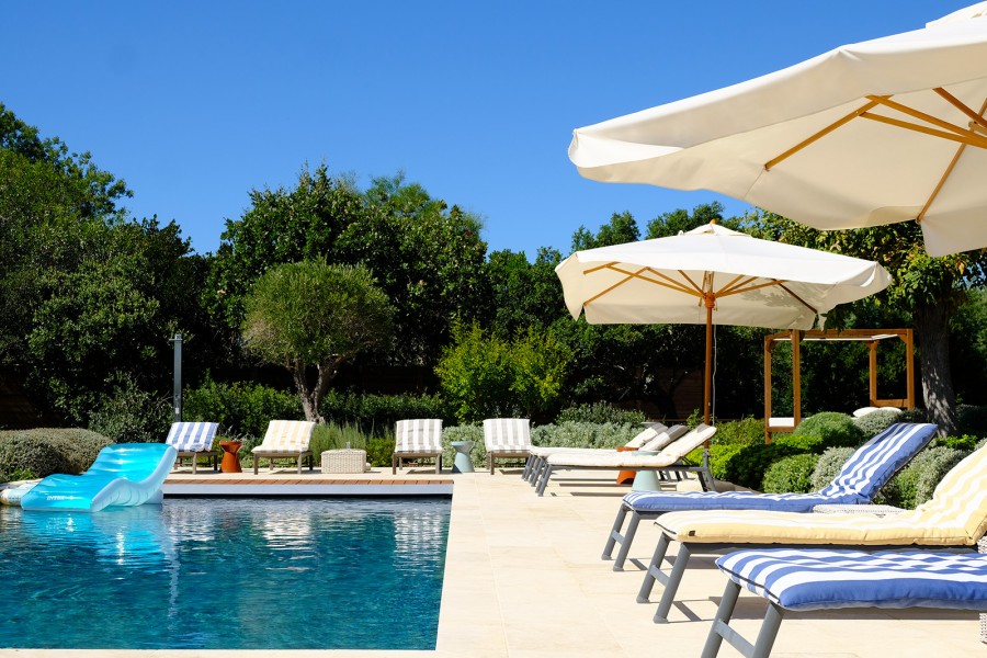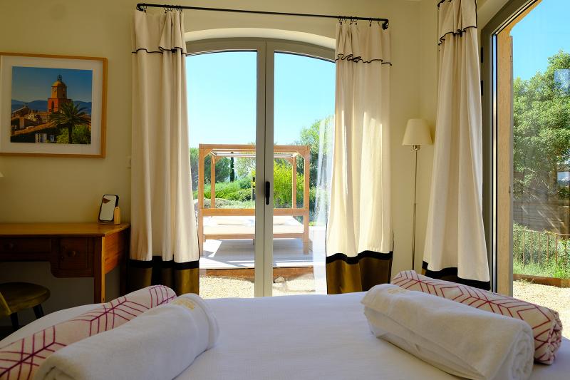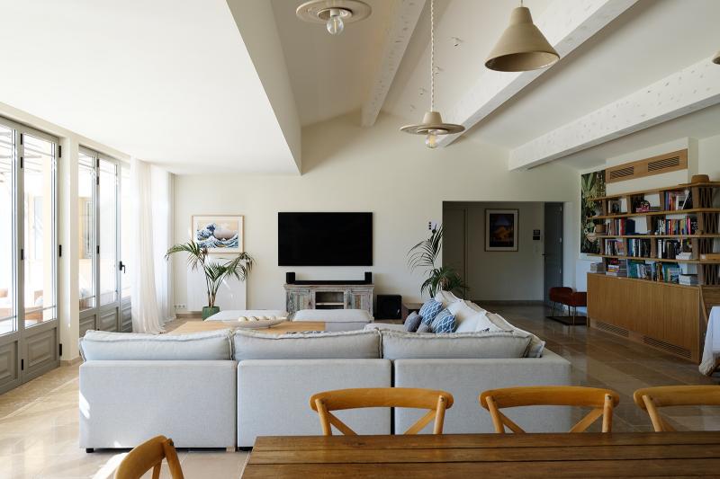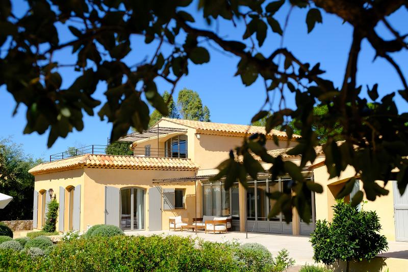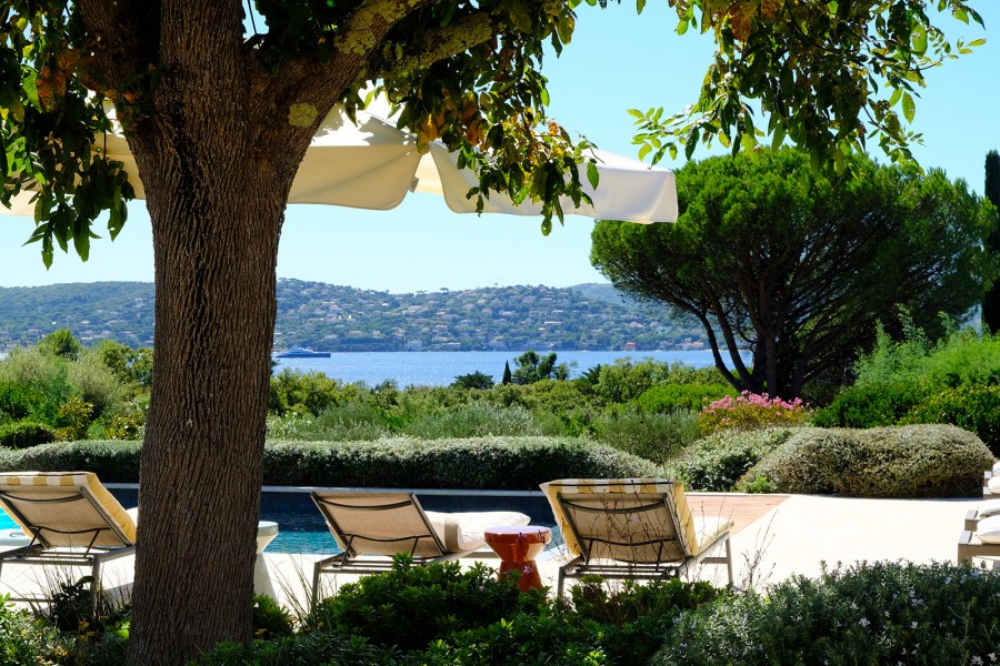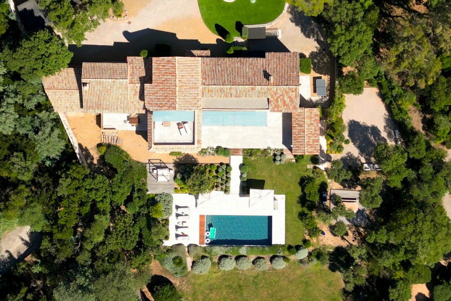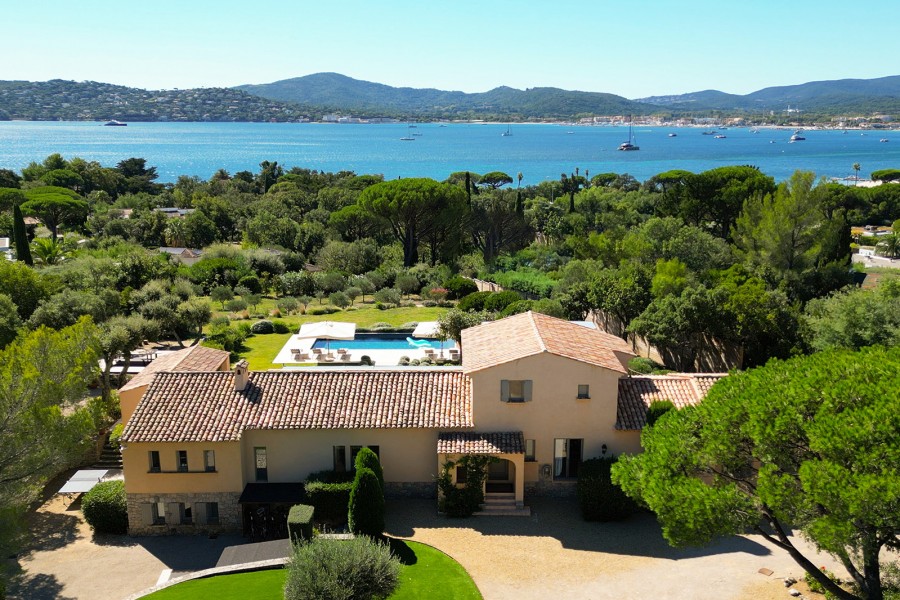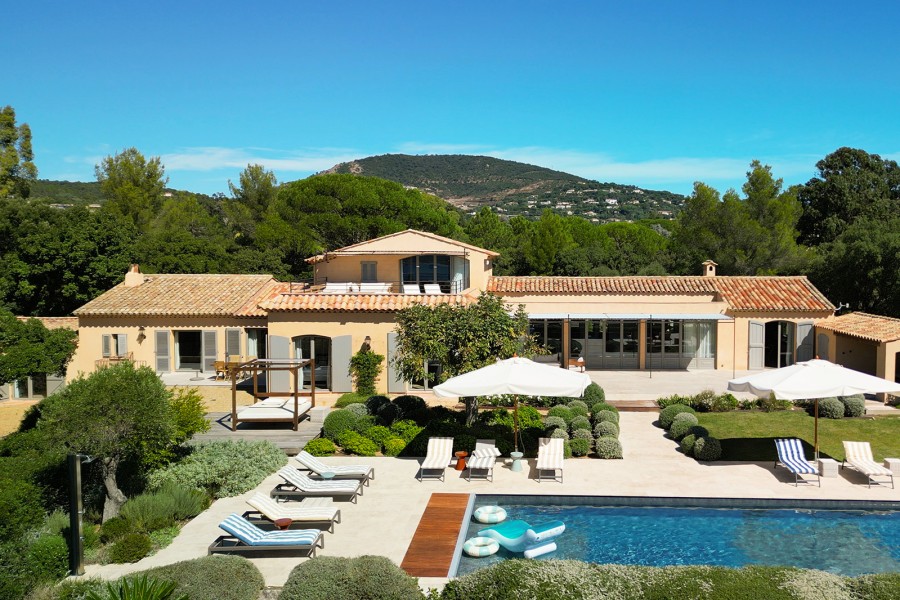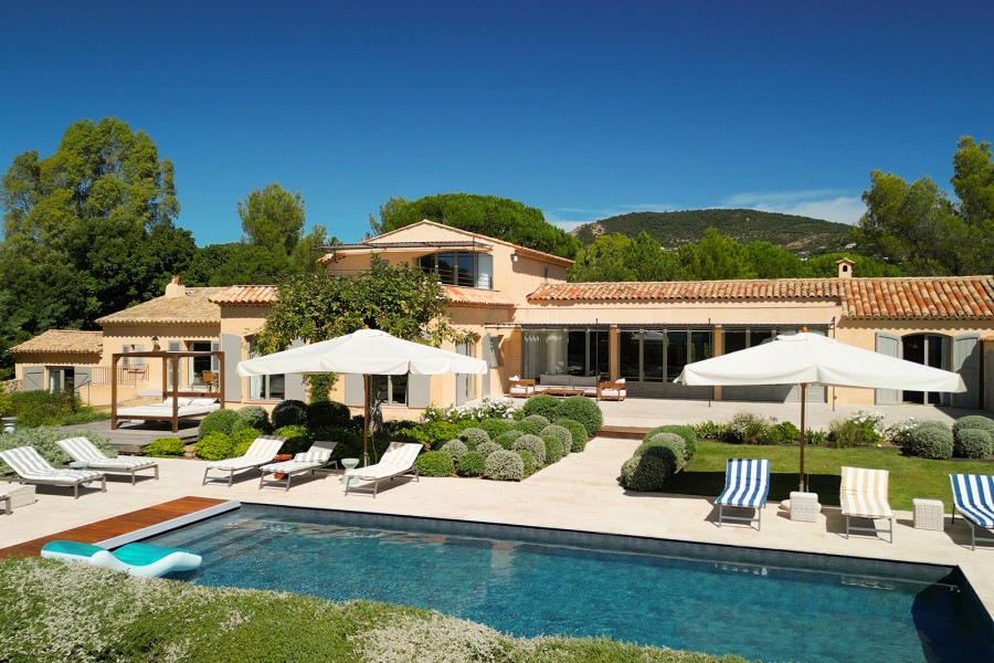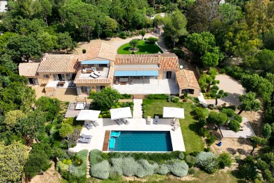Deze exclusieve villa heeft een royaal woonoppervlak van 400 m². Grote glaspartijen zorgen voor een breed uitzicht over de tuin met zwembad en richting de Golf van Saint-Tropez.