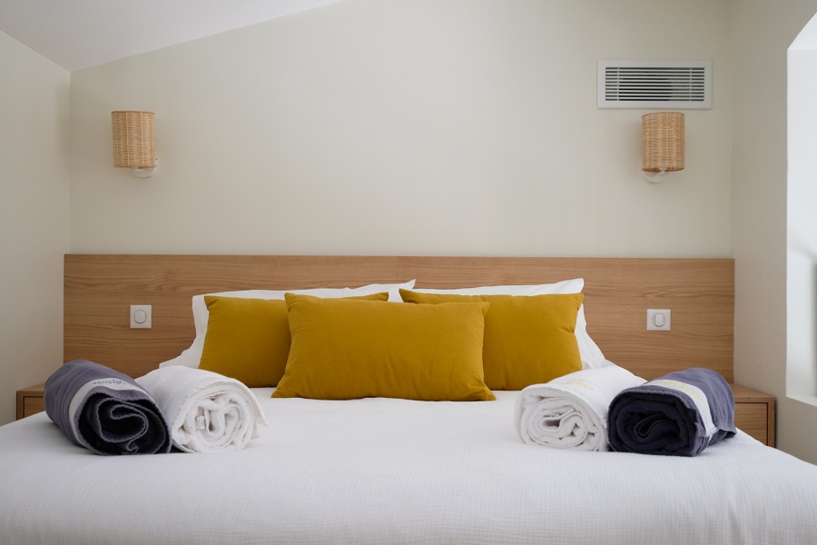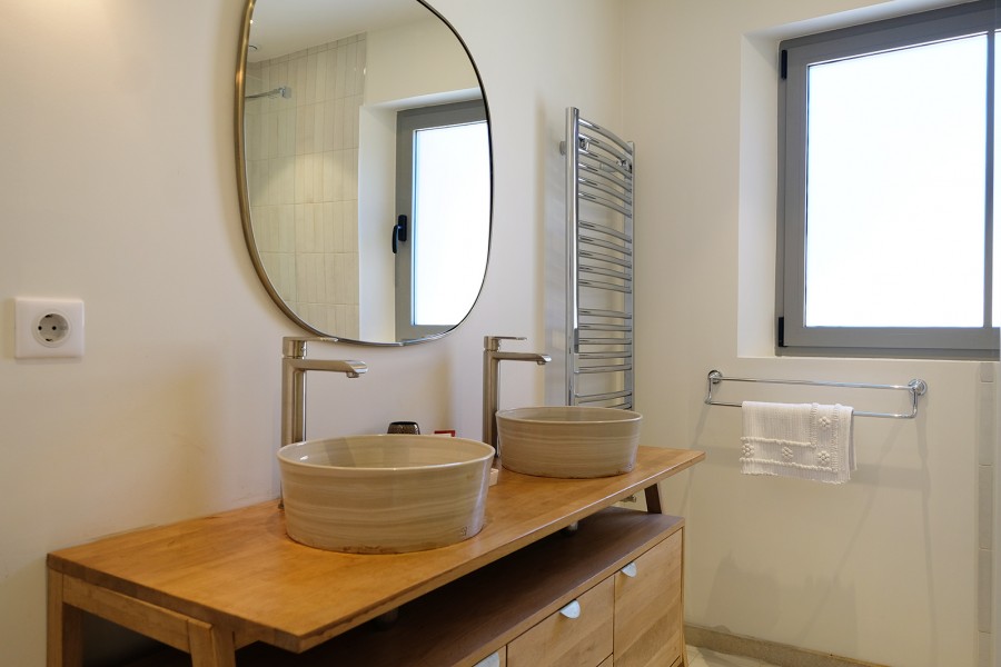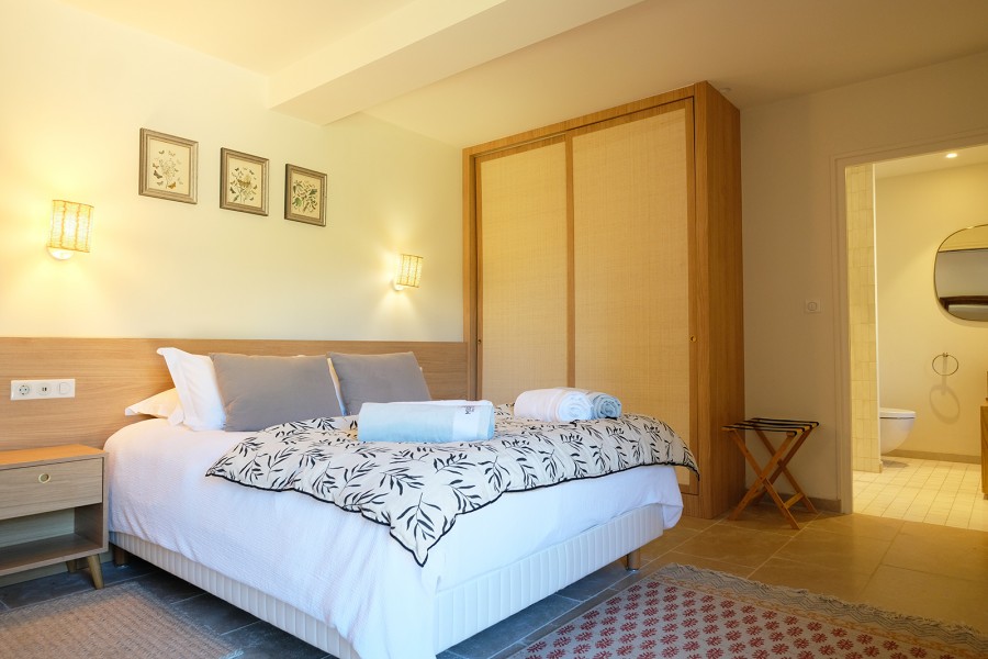 Slaapkamer 6 en 7, (begane grond) een familieappartement met twee slaapkamers en twee badkamers in duplex (één boven en één beneden) met een fraaie zithoek als verbindend element. Dit appartement is zowel vanuit de villa als via een eigen entree van buitenaf toegankelijk. Dit maakt het bijzonder geschikt voor ouders met jongere kinderen.