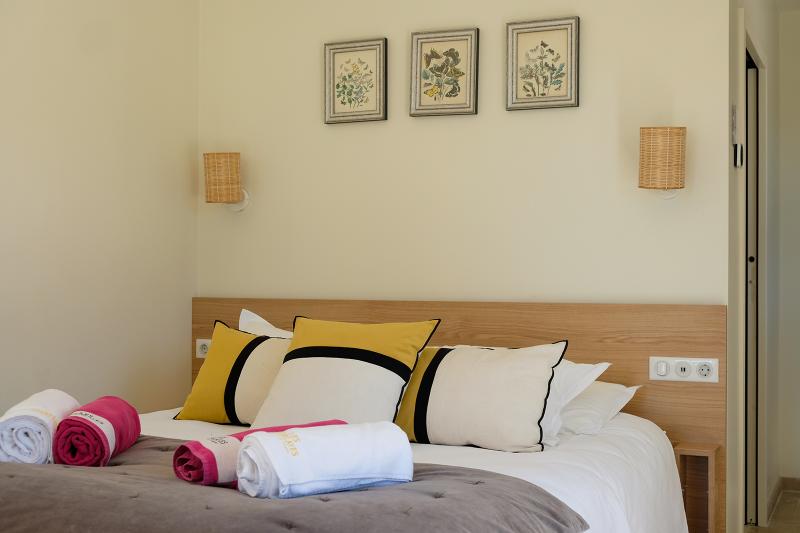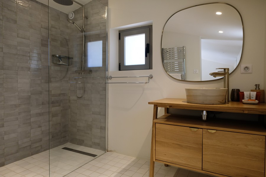 Slaapkamer 5, (benedenverdieping, naast de TV kamer), een ietwat eenvoudigere slaapkamer met tweepersoonsbed (180x200) en en-suite badkamer. Meer geschikt voor staff.
