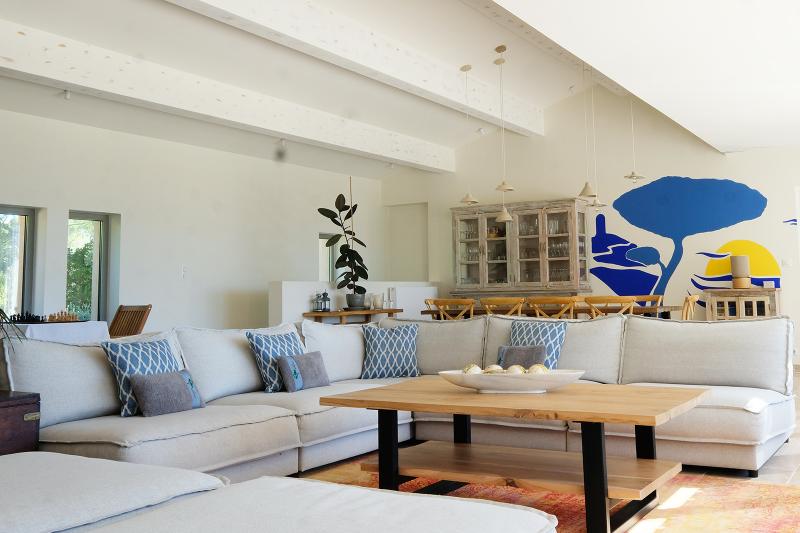 De living beschikt over een royale luxe zithoek en een eetgedeelte. Via grote glazen deuren is er directe toegang tot het terras. In het verlengde van de living bevindt zich de volledig ingerichte keuken met o.a. een grote oven, koelkast met diepvriesvak, aparte vriezer en een Nespresso-apparaat. Zowel de living als de keuken zijn voorzien van airconditioning. In de gehele villa is wifi aanwezig.