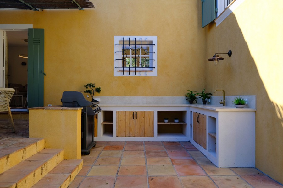 Het overdekte terras biedt een zomer keuken inclusief mooie BBQ. Perfect voor lange zomeravonden en het ultieme binnen-buitenleven. In de bijkeuken vindt u daarnaast een extra koelkast met vriesgedeelte.