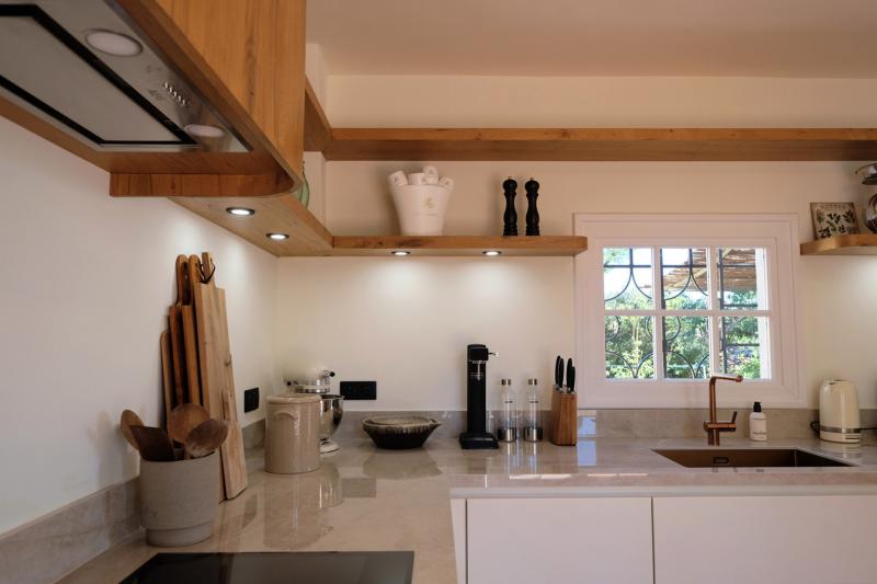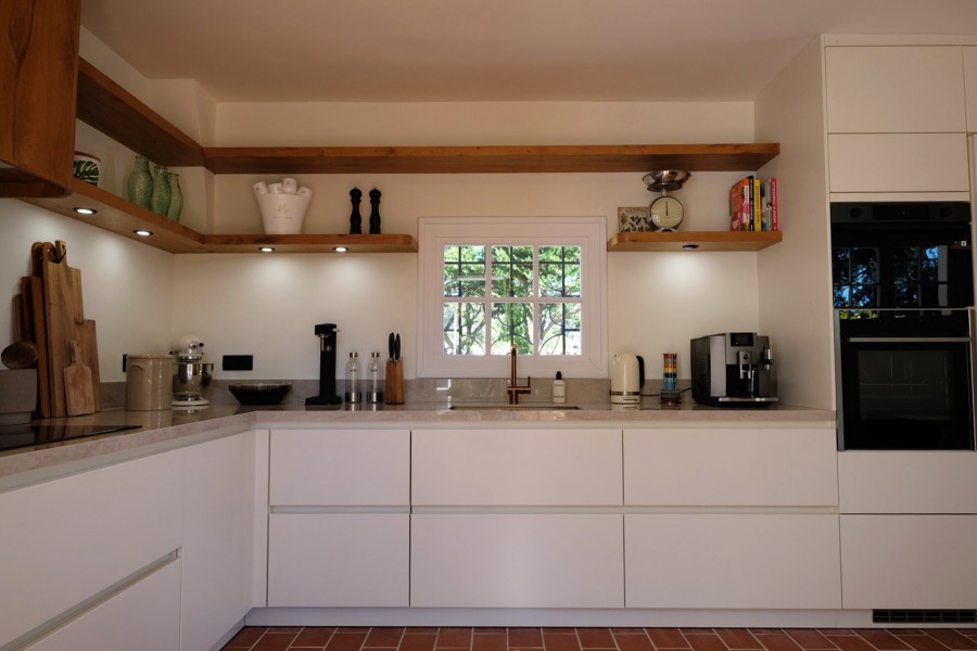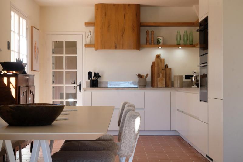 De royale moderne woonkeuken vormt het kloppend hart van de villa. Deze is voorzien van een royale eettafel voor 8 personen. De keuken biedt luxe keukenapparatuur waaronder een Jur a E8 volautomatische koffiemachine. De keuken biedt via toegang tot een overdekt terras met zomerkeuken alsook via openslaande tuindeuren naar de tuin en het zwembad.