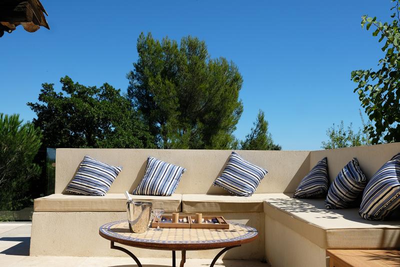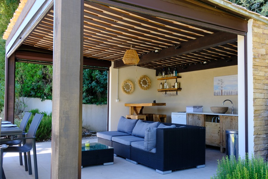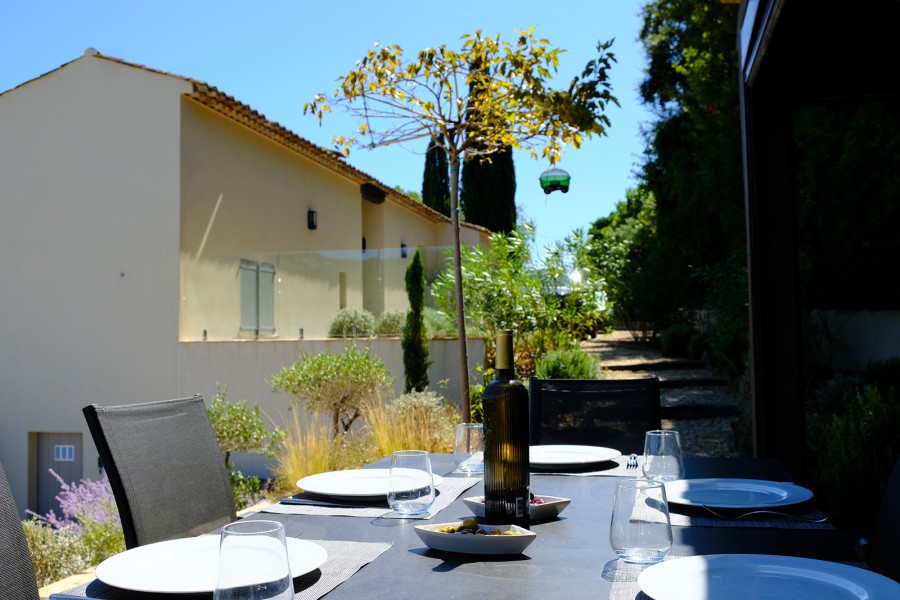 Grote schuifpuien verbinden de living met het terras. Een heerlijke plek grenzend aan de living. Hier staat een eettafel met 8 stoelen. Een fijne plek in de schaduw en ideaal om te ontbijten, lunchen of dineren.  Het privézwembad meet 10 x 4 m en ligt een niveau lager dan het terras. Het zwembad wordt omgeven door een royaal...